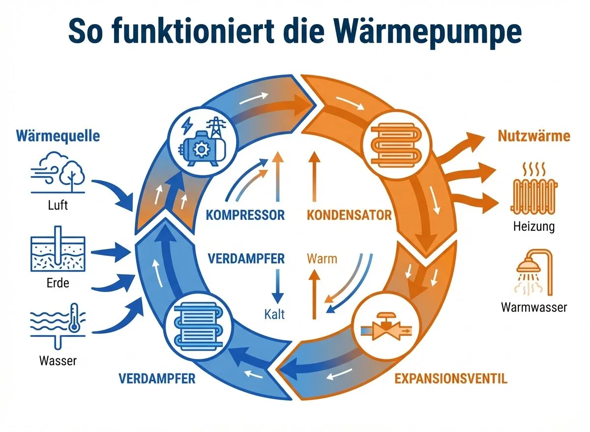 Sie interessieren sich für eine Wärmepumpe und möchten wissen, wie sie funktioniert, welche Typen es gibt und was das Ganze kostet? Dann sind Sie hier richtig. Auf dieser Startseite finden Sie einen kompakten Überblick über alles Wichtige rund um die Wärmepumpenheizung — von der Funktionsweise über aktuelle Kosten und Fördermöglichkeiten 2026 bis hin zu den Vor- und Nachteilen.
